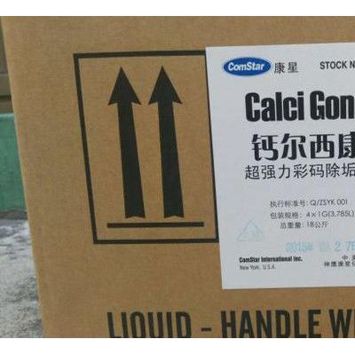 钙尔西康是目前市场上**有效的冷却塔及热交换器主机水垢去除剂。钙而西康也是国内市场上**一种被大规模用于冷冻水清洗的药水。 它的特殊色码配方可以根据颜色变化判断系统是否清洗干净。含有的金属缓蚀剂可确保普通金属部件不受到任何腐蚀,并在清洗后可以防止回锈产生。被用于开利、特灵、约克、三洋、奥克斯、盾安、国祥、艾斯特、堃霖、台佳等各种大型中央空调及冷冻系统。使用方法1.将系统排水后注满清水。2.对主机清洗,用1:20到30倍兑水;对整个冷却水系统清洗,用1:30到50兑水;对整个冷冻水系统清洗,用1:100到1:150兑水。3.初次加入钙尔西康,排水将呈黄色或其他颜色。为防止药水反应速度过快,阻塞系统,可以间隔30分钟将药水分3-4次加入。4.全部注入钙尔西康运行一段时间后,会发现PH值较投放初期明显变高。5.对系统打循环:若是主机清洗, 循环时间在8小时左右;若冷却水清洗,6-12小时左右;若冷冻水清洗,约12到24小时。6.按照建议剂量和时间循环后,若再次加入钙尔西康,水变成红色,表明已清洗干净。7.在排除废液以前, 请用**或苏打粉中和至7-8,这样可以保证排放污水达到**排放标准。8.用清水彻底冲洗系统1-2次以去除所有残留。9.注满清水后,定期加入ComStar缓蚀阻垢一体剂和微生物杀灭剂,以便保养系统。包装规格:1加仑(3.785L)
