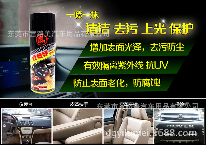 增加表面光泽,去污除尘。独特香味带来自然感受,亦适用于家用电器、家私、塑料制品上光。真正呵护爱车,一喷一抹,去污、上光、一次完成!