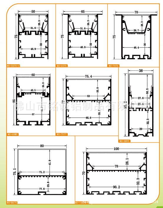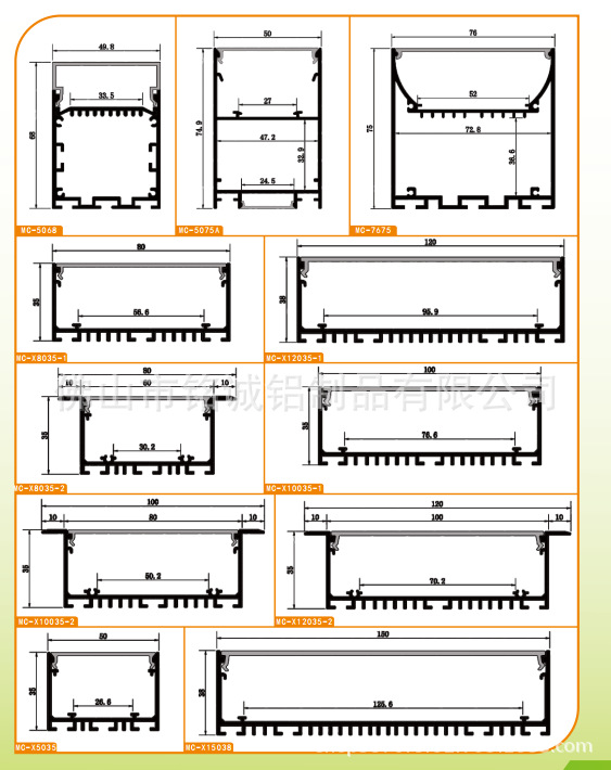 专业生产的产品系列有:led灯条铝槽 硬灯条铝槽 U形铝槽 led吊线灯铝槽套件 办公室吊装铝槽 明装暗装铝槽外壳套件 led洗墙灯回光槽套件,led踢脚线铝槽外壳套件, led洗墙灯外壳套件,led吊线灯外壳套件(最宽200mm),led硬灯条外壳套件(最窄8mm),led软灯带铝槽套件,led线条灯外壳套件,led暗槽灯外壳套件,亚克力pmma聚光透镜灯等各种室内灯饰铝槽套件皆应有尽有,市面上有的产品在佛山市铭诚铝制品有限公司都可以找到,欢迎您的选购,