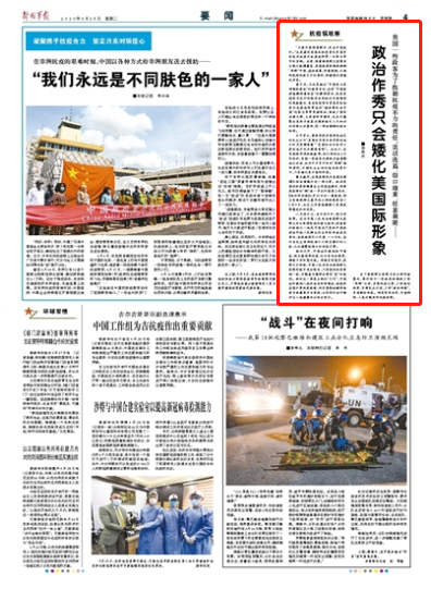 不可否认,曾经有很多国家和地区的民众以为“美国的月亮比世界其他地方的月亮都要圆”“美国的水比世界上其他地方的水都要香甜”。而如今,当美国确诊病例数激增,死亡病例达5万余例时,美国一些政客及媒体应该清醒地认识到,如此千方百计四处“甩锅”推卸责任,不顾民众生死的政治作秀行为,只会矮化美方国际形象。