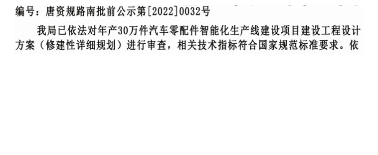 中国唐山发布《年产30万件汽车零配件智能化生产线建设项目批前公示》,详情如下: