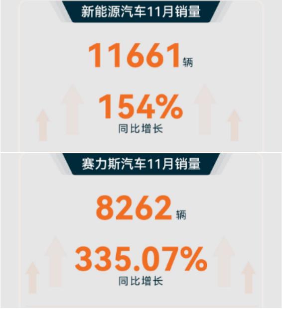 赛力斯集团股份有限公司(以下简称赛力斯)发布11月产销快报。11月,赛力斯新能源汽车销量11661辆,同比增长154%;其中,赛力斯汽车11月销量为8262辆,同比增长335.07%。