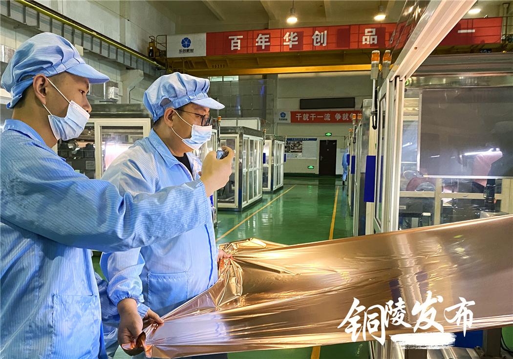 铜陵经开区安徽华创新材料股份有限公司生产车间,工人正在检查锂电铜箔箔面情况。据了解,该公司是专业从事新能源汽车电池负极集流体——锂电铜箔研发与制造的企业。近年来,公司抢抓新能源汽车发展机遇,不断加大研发力度,抢占市场。