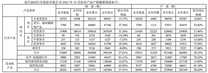 福田汽车11月8日发布2023年10月份各产品产销数据快报,10月汽车产品合计销量53069辆。本年累计销量503096辆,同比增长27.01%。