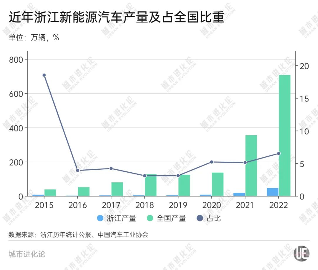 彼时,全国新能源汽车产量才37.9万辆,浙江一省份额就接近五分之一,并形成了较为完备的新能源汽车产业链。