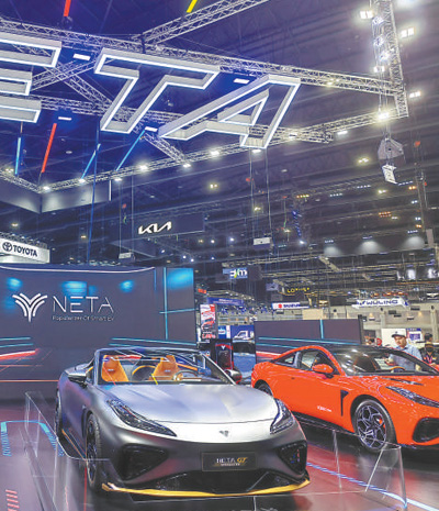 在2023年举办的第四十届泰国国际汽车博览会上,中国品牌新能源汽车广受关注。图为哪吒汽车展区。 本报记者 杨 一摄