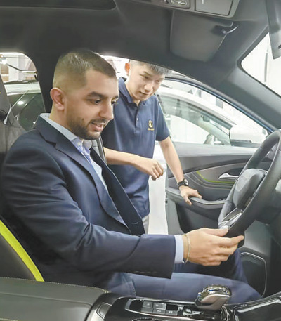 在阿联酋迪拜壹路集团汽车销售展厅,当地顾客体验东风风行品牌新能源汽车。 本报记者 任皓宇摄