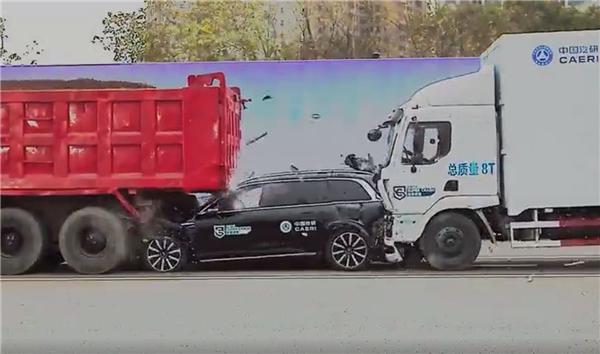 据悉,试验前卡车为静止 30 吨重载物自卸车,后卡车为 8 吨 10 米厢式货车,以 50km/h 速度行驶追尾。