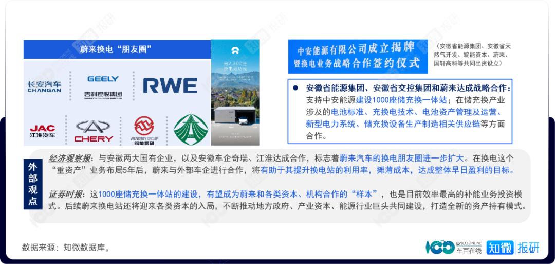 1月11日,蔚来与江淮汽车集团、奇瑞汽车分别签署了《换电战略合作框架协议》;同时,与安徽省能源集团等共同出资成立中安能源有限公司 。