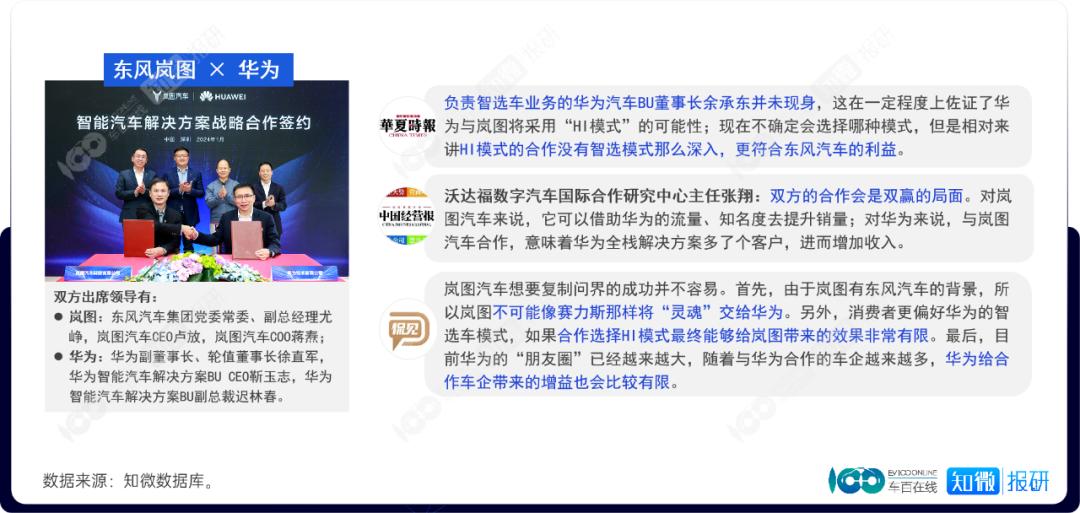 1月22日,东风岚图与华为签署战略合作协议。双方将围绕用户需求共同打造极致的智能出行体验,通过合作车型加速智能化技术大规模商业化落地。关于具体的合作模式,双方未透露,业内猜测,或以HI模式进行。