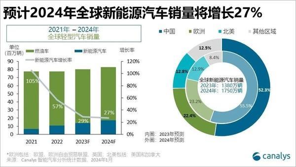 在汽车电动化、智能化浪潮的推动下 , 中国新能源汽车市场将继续保持高速增长。Canalys 数据显示 ,2023 年全年 , 全球新能源汽车销量预计增幅 29%, 达到 1370 万辆 , 渗透率达 17%。中国仍将保持最大新能源汽车市场地位 , 本地销量预计达 760 万辆 , 占全球新能源汽车市场 55.5%。预计 ,2024 年全球新能源汽车市场将增长 27%, 达 1750 万辆。其中 , 中国新能源汽车渗透率将达到 40%, 中国品牌将占据 78% 市场份额。