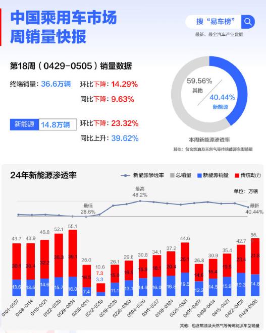 根据易车的最新数据,2024 年第 18 周,即 4 月 29 日至 5 月 5 日的中国汽车市场上,终端销量为 36.6 万辆,环比下降 14.29%,同比下降 9.63%。其中,新能源汽车终端销量 14.8 万辆,环比下降 23.32%,同比上涨 39.62%。以此计算,2024 年第 18 周,中国新能源汽车的渗透率为 40.44%。