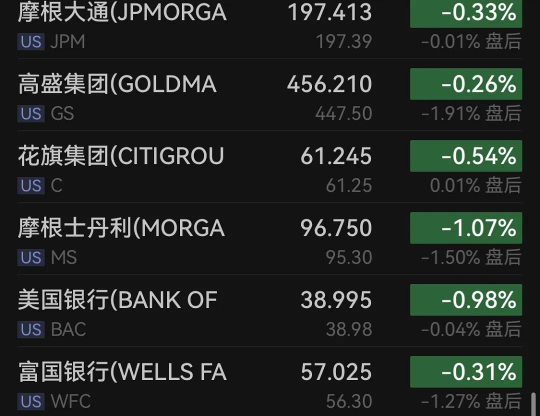 银行股全线走低,摩根大通跌0.33%,高盛跌0.26%,花旗跌0.54%,摩根士丹利跌1.07%,美国银行跌0.98%,富国银行跌0.31%。
