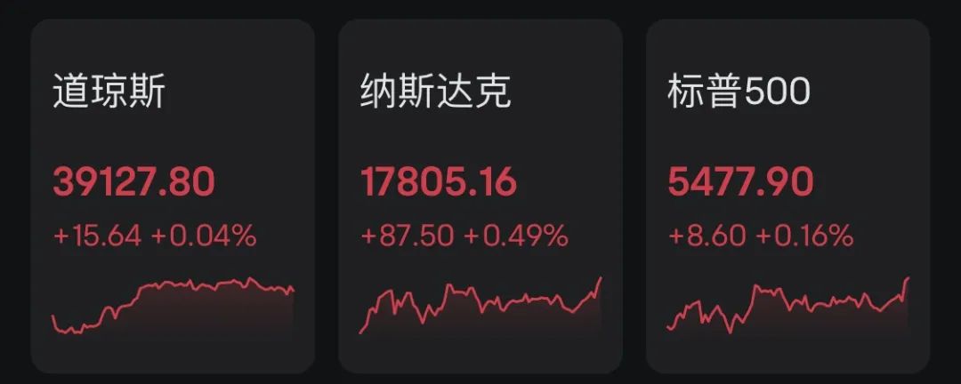 截至周三收盘,道指涨0.04%,报39127.8点,标普500指数涨0.16%,报5477.9点,纳指涨0.49%,报17805.16点。