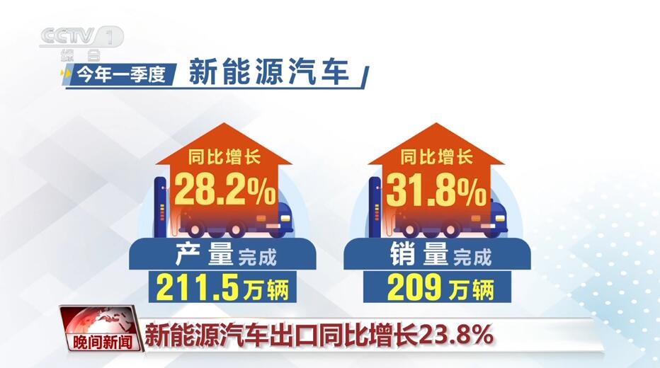 今年一季度,新能源汽车产销量分别完成211.5万辆和209万辆,同比分别增长28.2%和31.8%,市场占有率达到31.1%。其中,出口30.7万辆,同比增长23.8%。