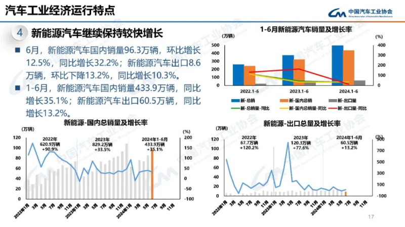 1-6月,新能源汽车国内销量433.9万辆,同比增长35.1%;新能源汽车出口60.5万辆,同比增长13.2%。