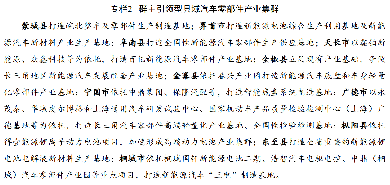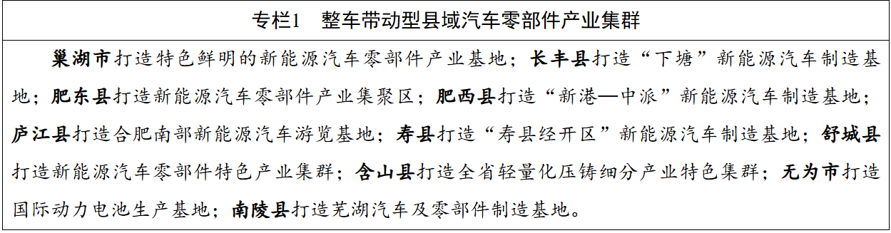 (一)整车带动型。整车是带动零部件产业集聚发展的关键。借鉴广州番禺、宁波慈溪、长春公主岭等地经验,鼓励整车企业总部或整车生产基地所在的县域及毗邻县域,依托已有的产业基础和优势,通过对整车进行上下游配套的方式形成整车带动型零部件产业集群。以省内7家整车企业为牵引,加快推动生产制造基地或核心零部件企业在周边县域布局,重点打造“下塘”“新港—中派”“寿县经开区”新能源汽车制造基地,“无为经开区”“庐江高新区”“舒城经开区”动力电池生产和回收基地,“南陵经开区”新能源汽车零部件智能化柔性制造基地,“含山经开区”汽车轻量化配套示范基地等。
