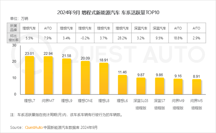 2、从车系级别来看,增程式新能源汽车多为SUV车系,QuestAuto数据显示,2024年9月,增程式SUV活跃量已达162.66万辆,轿车18.76万辆