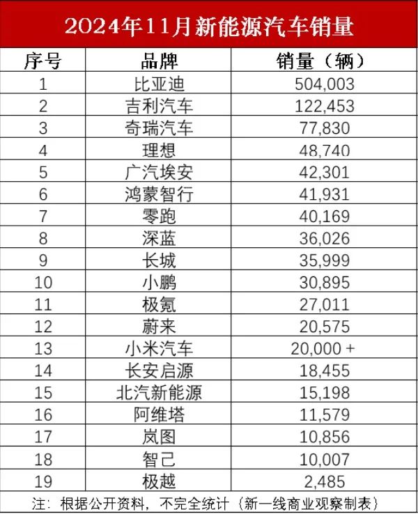 昨日,各大新能源车企相继上交11月交付成绩单,根据公开数据,新一线商业观察整理了一份11月新能源汽车销量排名表。