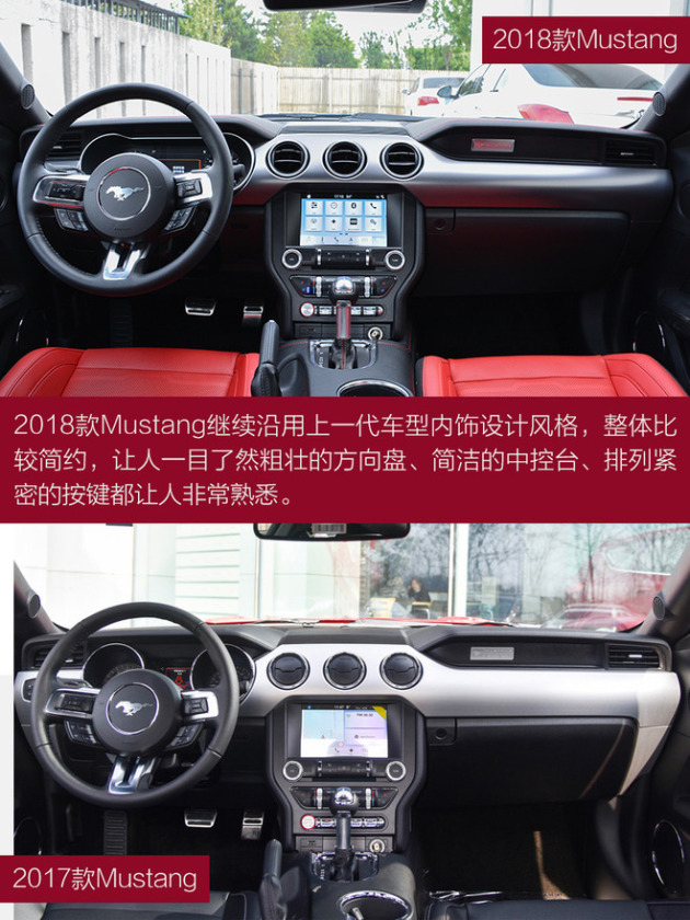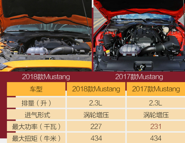 动力系统是此次新款Mustang变化最大的地方,延续2.3L四缸涡轮增压发动机和5.0的自吸八缸发动机机。2.3升涡轮增压发动机最大功率由此前的314马力下调为309马力;而5.0L V8 GT车型配备升级调校过的5.0升V8发动机,最大功率增加至343千瓦,峰值扭矩高达556牛米。