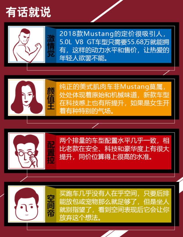 2018款Mustang通过舒适与安全性配置的增加,正在努力为驾驶者打造更具科技感的车型。10速变速箱提供了更好的平顺性和燃油经济性,更重要的是的性能也会得以提高。如果你比较在乎性价比,那么2.3T车型能够兼顾实用与情怀;但如果更想体验纯粹的美式肌肉车和逐渐消退的大排量自吸,那么5.0L V8 GT版本不管在售价还是性能上都无疑是个绝佳选择。
