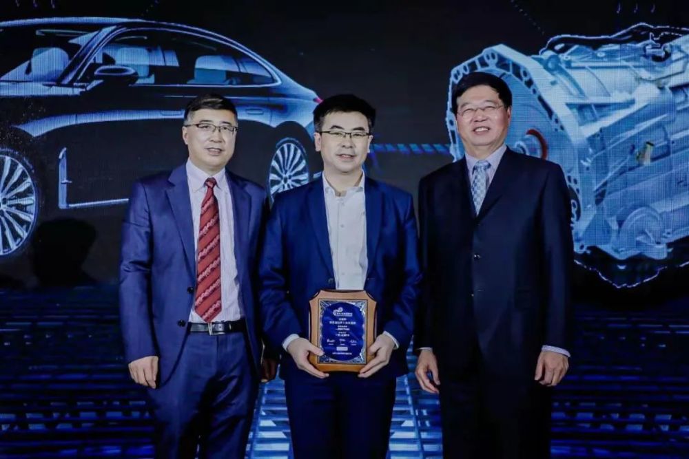 世界十佳变速器评委会主席、北京航空航天大学汽车工程系教授、院学术委员会主任、国家乘用车自动变速器工程技术研究中心常务副主任徐向阳(左一)与汽车评价研究院院长李庆文(右一)共同为中国一汽新能源开发院副院长赵慧超颁奖