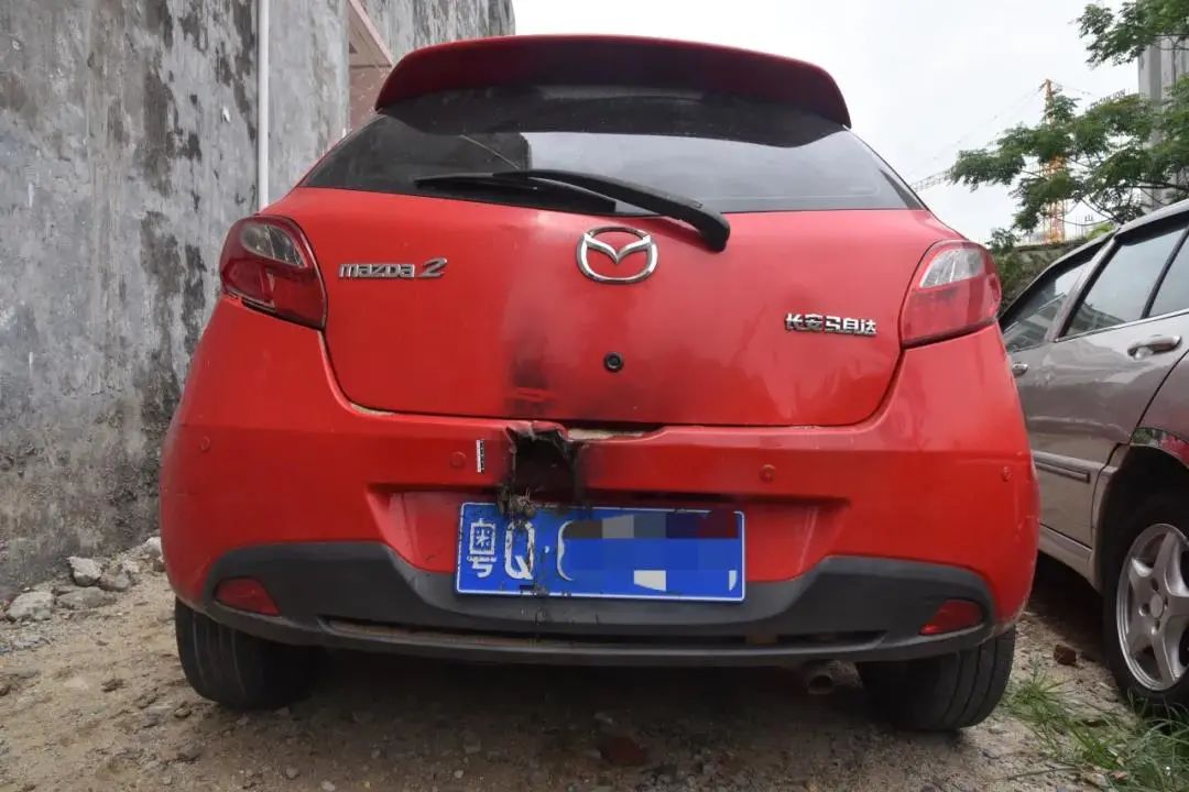 有一辆红色小汽车尾部
