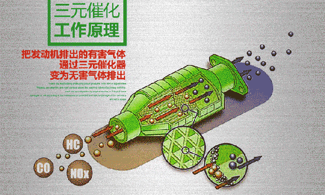 三元催化指的正是上述三种物质,HC碳氢化合物、NOx氮氧化物、CO一氧化碳;催化器的滤芯里有“铂铑钯”三种贵金属,与这三种尾气成分进行反应之后,可以生成相对无害的二氧化碳(温室气体)、氮气、水等。