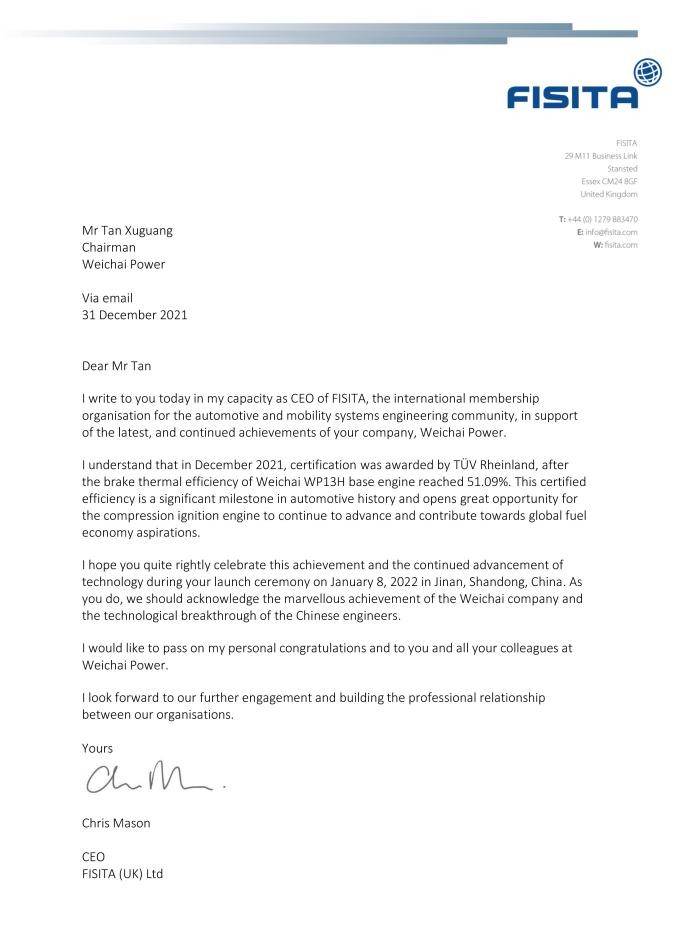 国际汽车工程师学会联合会是由众多汽车和动力系统工程师所组成的国际组织,CEO克里斯·梅森在贺信中表示,潍柴WP13H发动机的本体机热效率达到51.09%,并于2021年12月获得认证。这是汽车发动机行业科技进步史的一个重要里程碑,也将为全球行业可持续发展和节能减排作出重大贡献。