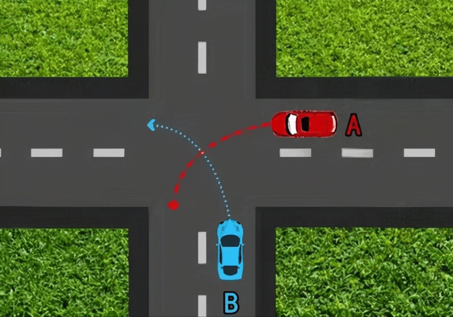 红车与蓝车同时左转发生事故,蓝车全责。