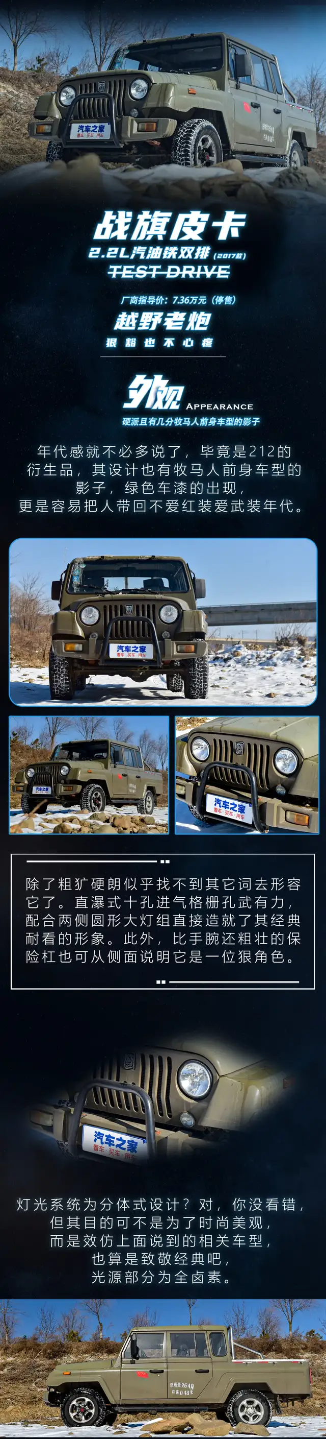 造型酷似Jeep角斗士;非承载式车身;拥有分时四驱系统;上山下河都不怂;能坐5人又能拉货;关键当时新车售价才7万出头……说到这,可能会有看官猜它是BJ212,这仅说对了一半,也不卖关子了,它是BJ212的衍生车型——北京汽车制造厂-战旗皮卡。
