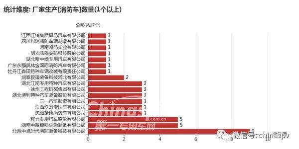 本次公告中的46款消防车的生产企业共有17家,北京中卓时代消防装备科技有限公司(9辆)、湖南中联重科应急装备有限公司(5辆)、程力专用汽车股份有限公司(5辆)、沈阳捷通消防车有限公司(3辆)、江西玖发专用车有限公司(3辆)、三一汽车制造有限公司(3辆)、湖北博利特种汽车装备股份有限公司(3辆)、徐州工程机械集团有限公司(3辆)、湖北江南专用特种汽车有限公司(3辆)、润泰救援装备科技河北有限公司(2辆)、牡丹江森田特种车辆改装有限责任公司(1辆)、广东永强奥林宝国际消防汽车有限公司(1辆)、湖北新中绿专用汽车有限公司(1辆)、明光浩淼安防科技股份公司(1辆)、河南鸿马实业有限公司(1辆)、四川川消消防车辆制造有限公司(1辆)、江西江铃集团晶马汽车有限公司(1辆)。