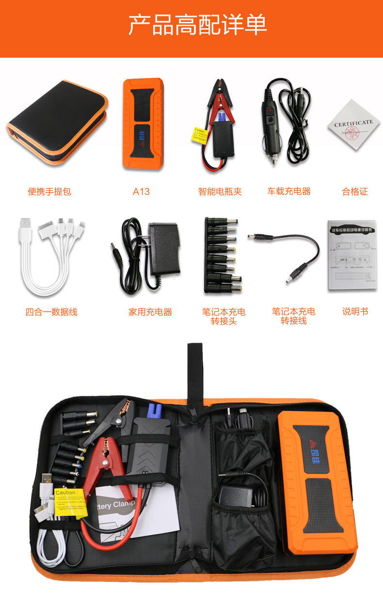 汽车应急启动电源是为汽车爱好者和商人开发的一种多功能便携式移动电源。其特征功能是在汽车失去动力或由于其他原因无法启动时启动汽车。同时,它将充气泵的功能与应急电源和室外照明相结合。它是户外旅行的必备产品之一。