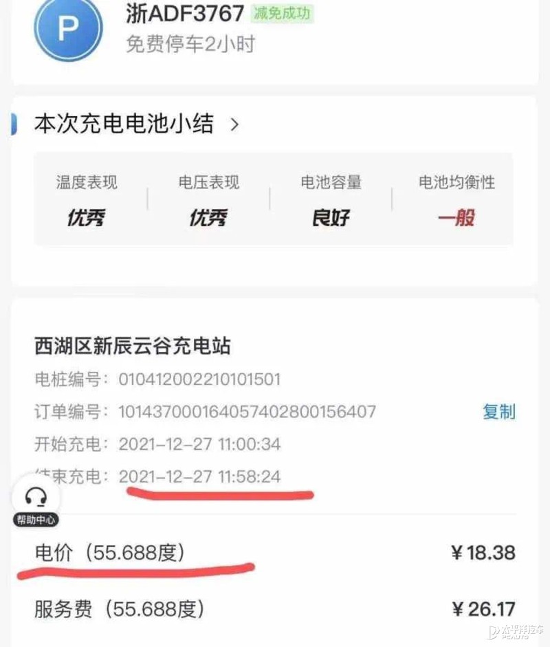 不仅这一次,几乎每一次的充电都有类似充电数据不符的情况,其中一次充电是几乎开到没电的情况下进行充电的,车机显示充电量是67kWh,实际付款的度数是55.68kWh,两者相差有12度之多。