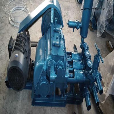 泥浆泵为卧式三缸往复单作用活塞泵,是地质勘探的主要配套设备之一。其主要作用是在岩心钻探过程中向钻孔供给冲洗液(泥浆或清水),使之在钻孔中循环,以达到携带岩屑返回地面,冷却与润滑钻头及钻具、保护孔壁防止垮塌,也可作为地基处理工程中的水泥浆灌注泵,输送水泥浆的水灰比可达1:1,具有外形尺寸小、结构紧凑、易于安装拆卸、便于搬运等特点。