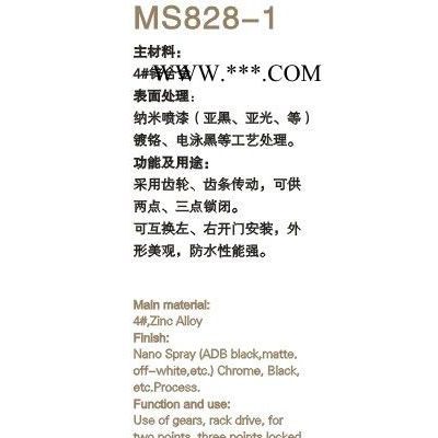 功能及用途:采用齿轮、齿条传动,可供两点、三点锁闭使用。可互换左、右开门安装,外形美观,防水性能强。