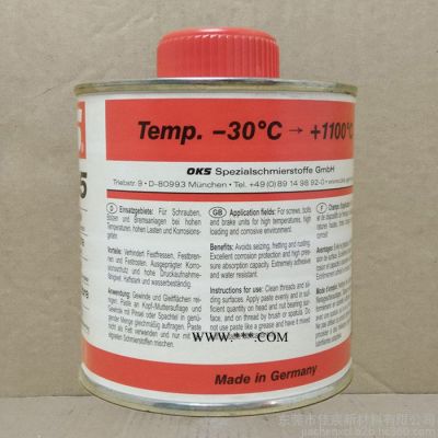 型号: 245 型号: 245 1kg 颜色分类: 250g 1kg 5kg OKS 245-高效防腐铜膏 应用范围 : 用于润滑承受高温和受到腐蚀的螺纹连接件,如:内燃机上的螺栓,管道上的螺丝,过热蒸汽管线上法兰连接件和配件,排放管和燃烧室的螺螺纹连接件,燃气炉和油炉安装螺栓等。能防止设备高温长时间运行后粘结,卡合或生锈。能使螺杆紧固扭矩达到佳比例从而起到保护作用,并能确保可靠无损坏的拆卸。 优点 : 有效防止螺纹在高温,腐蚀和潮湿环境中发生粘结**的压力吸收能力使效果非常突出。 具有优异的防腐蚀性能,能完全防止淡水及盐水,具有极强的表面粘合力。不含铅和铅化合物。 使用方法 : 为了得到优异的粘合力,要清除螺纹和滑动表面的不洁物和其它润滑剂。好的方法是先用物理方法清洁,然后用OKS 2610 或OKS 2611通用清洁剂清洁。 用刷子,刮抹刀等将润滑膏充分地均匀地抹在螺帽支撑件和螺纹上。润滑膏能有效防止渗透激溅和激冷水腐蚀。 不要用润滑膏代替油脂,本产品只能和合适的润滑剂相混合使用。 工作温度:-30℃——+1100℃。 外观:铜棕色