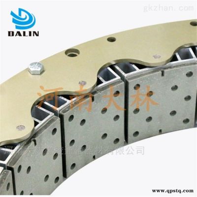 向气胎内施加气压,气胎膨胀,均匀地推动摩擦瓦组件,抱紧与从动元件连在一起的摩擦轮毂上。摩擦瓦组件由装在铝制垫板上的摩擦片构成,由固定在侧板上的力矩杆导向。力矩从驱动轴开始,通过安装离合器 的部件(通常为铁制法兰)、轮缘侧板结构,再由力矩杆传给垫板和摩擦材料,这样力矩就经摩擦副传到了安装在从动轴上的部件上(离合器轮毂及其安装部件)。释放驱动气压,在释放弹簧和离心力的作用下离合器分离。